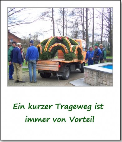 Die Bilder ähneln sich und dennoch sind alle Beteiligten jedes Jahr aufs Neue gespannt. Sitzen alle Handgriffe? Geht beim Transport alles gut? Und wie wird das gebundene und gesteckte Osterbrunnengestellt auf dem Brunnen aussehen?