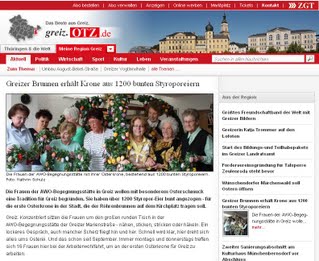 2011-presse-osterbrunnen-greiz-otzGreiz. Konzentriert sitzen die Frauen um den großen runden Tisch in der AWO-Begegnungsstätte der Greizer Marienstraße – nähen, sticken, stricken oder häkeln. Ein lockeres Gespräch, auch mancher Scherz fliegt hin und her. Schnell wird klar, hier dreht sich alles ums Osterei. Und das schon seit September. Immer montags und donnerstags treffen sich 16 Frauen hier bei der Arbeiterwohlfahrt, um an der ersten Osterkrone für Greiz zu arbeiten.